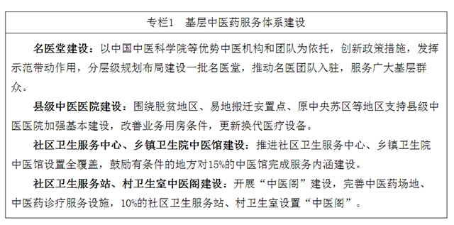 ——基层中医药服务提供基本实现全覆盖,100%社区卫生服务中心、乡镇卫生院能够规范开展10项以上中医药适宜技术,100%社区卫生服务站、80%以上村卫生室能够规范开展6项以上中医药适宜技术;