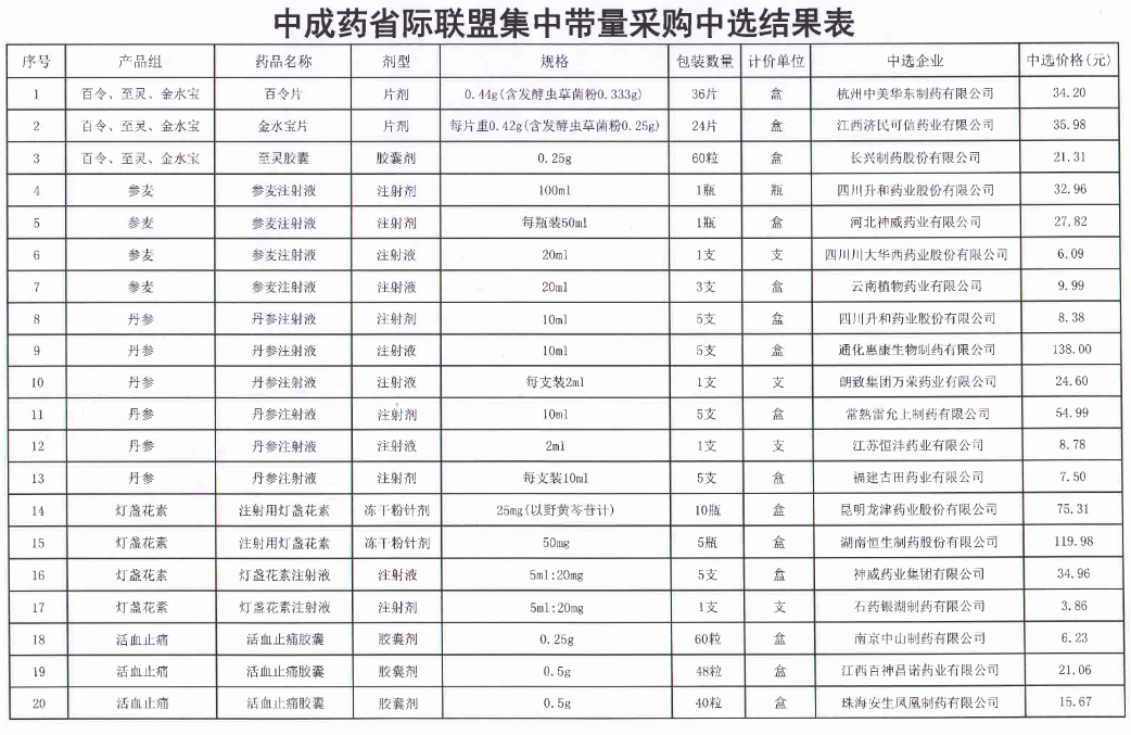 广东本次采购包含独家品种和非独家品种,其中独家品种包括海南九芝堂药业的裸花紫珠栓、天士力的复方丹参滴丸、通化白山药业的复方丹参喷雾剂、山东宏济堂制药的大活络丸、江西药都樟树制药的大活络胶囊等45个品种。