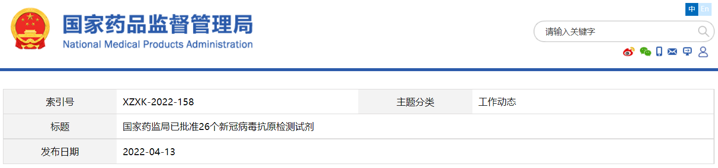 4月13日,国家药监局发布公告称,4月12日国家药监局再次审查批准2个新冠病毒抗原检测试剂产品。截至4月12日,国家药监局已批准26个新冠病毒抗原检测试剂产品。