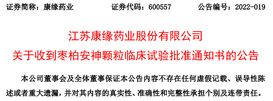 4月14日,康缘药业发布公告称,公司近日收到国家药监局签发的枣柏安神颗粒《药物临床试验批准通知书》,同意开展用于肝血不足、虚热内扰所致的慢性失眠症的临床试验。
