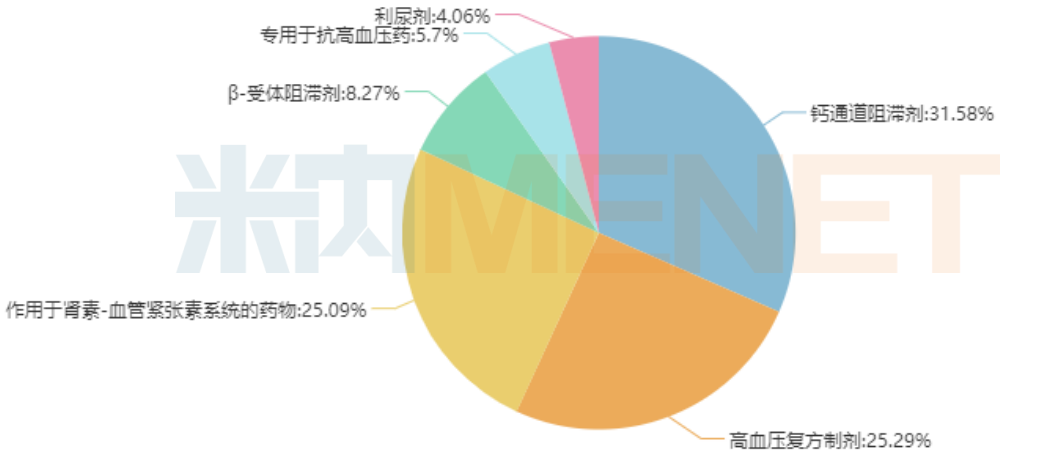 从治疗小类来看,钙通道阻滞剂、高血压复方制剂、作用于肾素-血管紧张素系统的药物位列前三,合计市场份额超过80%。