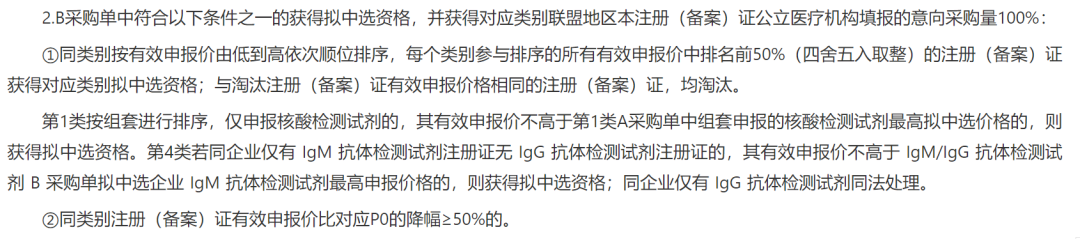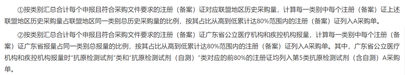 带量采购按照试剂耗材类别和历史采购量分为A、B两组。第2、3类所有申报且符合采购文件要求的注册(备案)证全部列入A采购单,第1、4、5、6、7、8类中符合以下条件之一的纳入A采购单,其余申报且符合采购文件要求的注册(备案)证列入B采购单:
