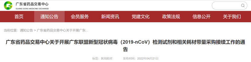 4月21日,广东省药品交易中心发布《关于开展广东联盟新型冠状病毒(2019-nCoV)检测试剂和相关耗材带量采购接续工作的通告》,正执行的新冠检测试剂和耗材采购周期将于2022年5月25日届满,18省联盟将组织开展接续带量采购工作。