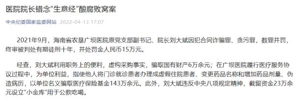近日,中纪委公众号发布文章《医院院长错念“生意经”酿腐败窝案》,海南省农垦广坝医院原党支部副书记、院长刘大斌利用职务上的便利:虚构采购事实,骗取国有财产6万余元;虚增住院患者、变更药品名称和增加药品剂量、伪造病历,骗取医疗保险基金143万余元;截留资金23万余元设立“小金库”用于公款吃喝。