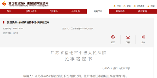 基于以上原因,宿迁中院认为对于民丰银行提出的破产清算申请应当予以受理。
