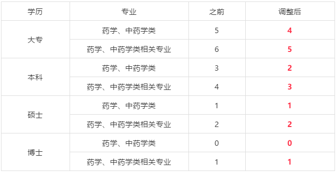 值得一提的是,最新版《执业药师职业资格制度规定》对报考执业药师的要求更高了:其一,将最低学历要求从中专调整为大专;其二,适当提高相关专业考生从事药学(中药学)岗位的工作年限。
