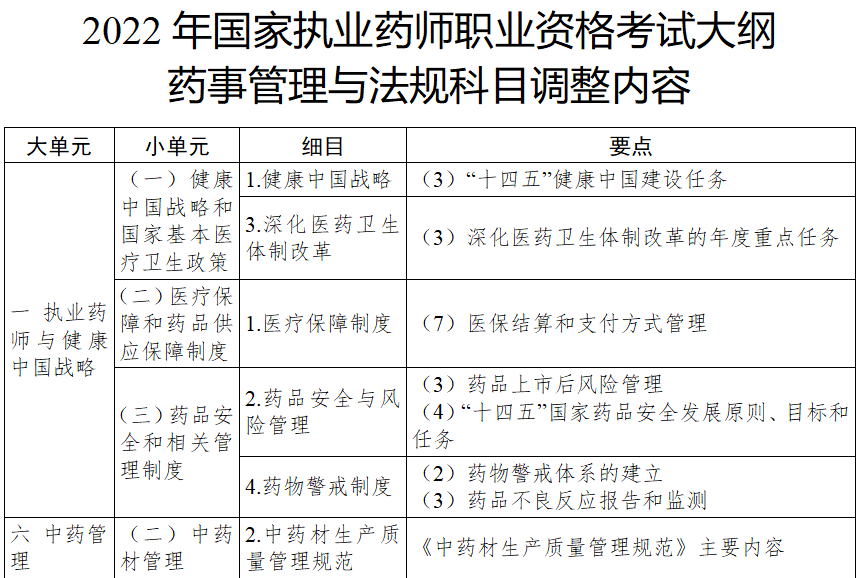 《通告》指出,为做好2022年国家执业药师职业资格考试工作,受国家药监局委托,根据《国家执业药师职业资格考试考试大纲(第八版)》(以下简称《大纲》)相关规定,确定2022年执考药事管理与法规科目大纲部分内容调整事宜。