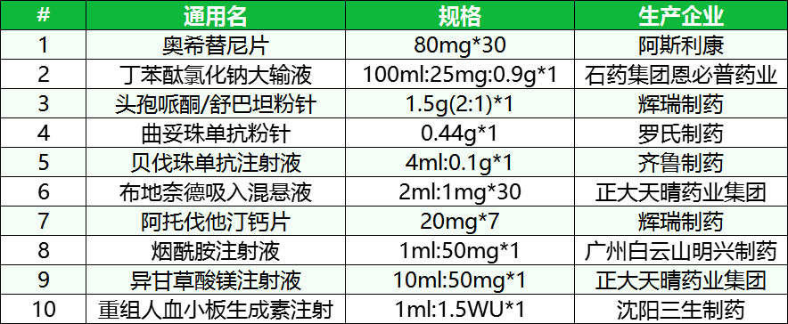 4月26日,河南省公示了2022年第一季度省平台交易相关数据,其中,统计网上交易金额前十名药品,结果见下表(单位:亿元):