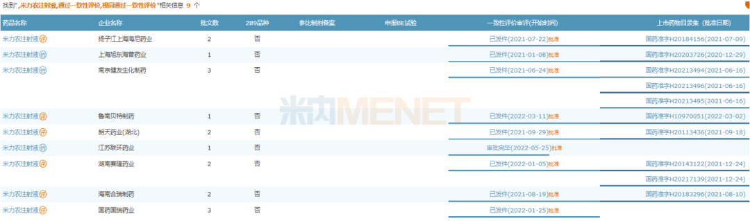 5月31日,联环药业发布公告称,公司以仿制4类报产的米力农注射液获批,视同过评。米内网数据显示,2021年中国公立医疗机构终端米力农注射液销售额超过9亿元。该产品是第七批拟集采目录品种,目前,鲁南贝特制药、国药集团国瑞药业、扬子江药业集团上海海尼药业等9家企业过评。