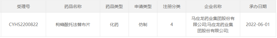 6月1日,“痔疮一哥”马应龙提交了枸橼酸托法替布片4类仿制上市申请。近年来,马应龙不断加大在化药领域的布局,枸橼酸托法替布片有望成为公司在抗肿瘤和免疫调节剂这个千亿市场首个上市的产品。