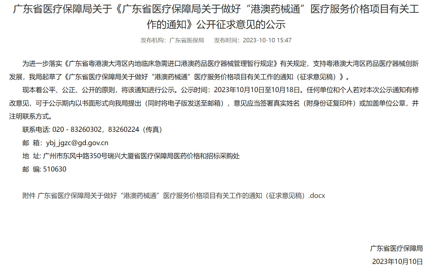 10月10日,广东省医保局发出通知,对《广东省医疗保障局关于做好“港澳药械通”医疗服务价格项目有关工作的通知(征求意见稿)》(以下简称征求意见稿)进行公示,公示时间为2023年10月10日至10月18日。