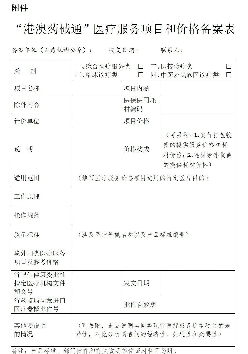 一、“港澳药械通”医疗服务项目实行备案管理。指定医疗机构应用经批准纳入“港澳药械通”的医疗器械,提供医疗服务需设立的医疗服务项目(以下简称“港澳药械通”医疗服务项目),实行省级备案,属地监管,加快临床转化进度。备案“港澳药械通”医疗服务项目和价格由指定医疗机构参考境外地区成熟做法,遵循公平、合法和诚实信用的原则自主确定,不以现有项目加收项的形式立项。指定医疗机构向省医保局提交《“港澳药械通”医疗服务项目和价格备案表》(见附件)及有关佐证材料(其中涉及医用耗材的需先获得国家医保医用耗材编码)。省医保局公开已备案的“港澳药械通”医疗服务项目。备案内容有调整的应重新备案。其他指定医疗机构使用“港澳药械通”医疗器械实施相同医疗服务的,参照已报备实施的项目名称、内涵等要素备案,提高效率。