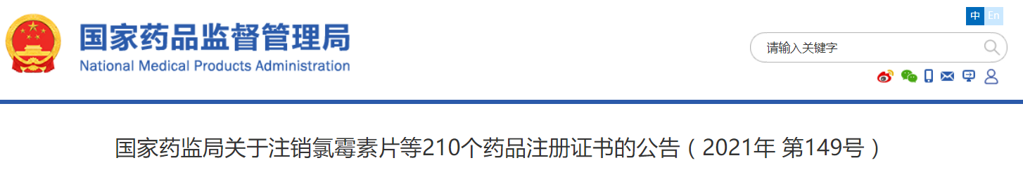 国家药监局关于注销氯霉素片等210个药品注册证书的公告(2021年 第149号)
