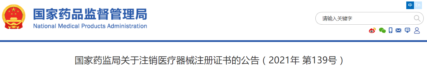 国家药监局关于注销医疗器械注册证书的公告(2021年 第139号)