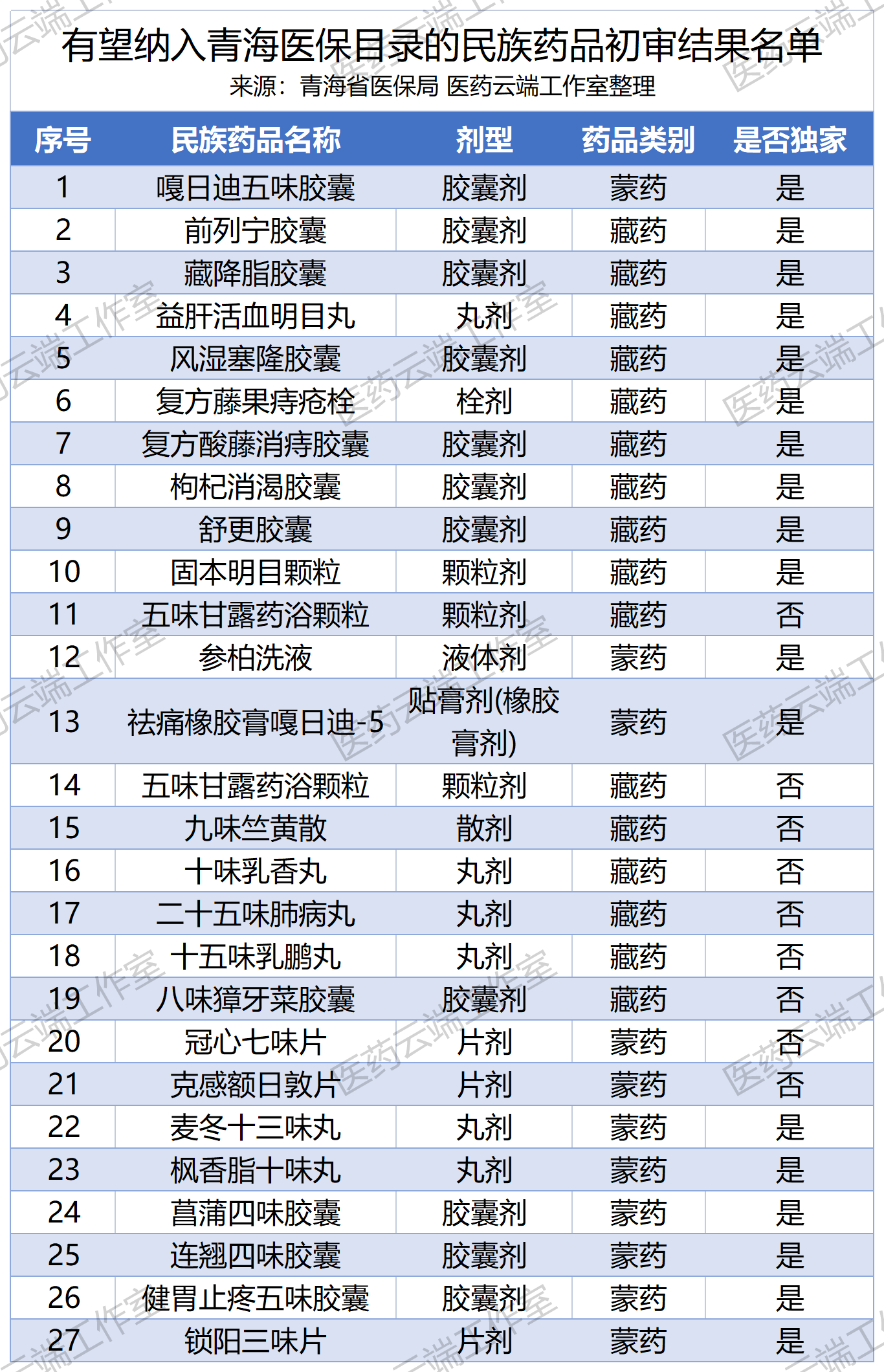 医药云端工作室梳理发现,此次通过初步审查的27个民族药中,藏药有16个,蒙药有11个,其中18个是独家品种。