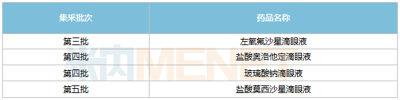 在国家集采初始,眼科用药因过评品种屈指可数而不被纳入,直到第三批集采才出现眼科用药的身影。第三、第四、第五批集采中,左氧氟沙星滴眼液、盐酸奥洛他定滴眼液和玻璃酸钠滴眼液、盐酸莫西沙星滴眼液相继被纳入。
