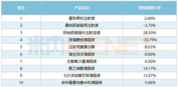 眼科用药产品TOP10中,位列第一、第二的雷珠单抗注射液、康柏西普眼用注射液上半年销售额均超过7亿元,阿柏西普眼内注射溶液上市以来销售额一路猛涨,首次跻身第三。