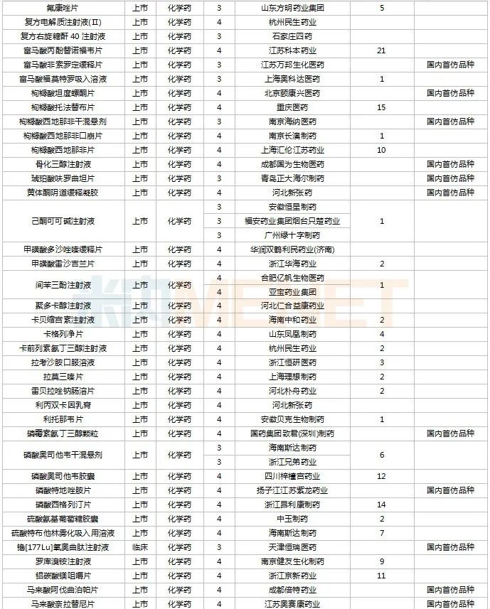 2022年11月,天津红日健达康医药、上海璎黎药业、山东绿叶制药等均有1类新药获批上市。山西振东安欣生物制药的胶体果胶铋颗粒为新剂型获批。默沙东的帕博利珠单抗注射液再获批新适应症。81个仿制药获批上市(含进口5.2类),吡美莫司乳膏(江苏知原药业)、氮䓬斯汀氟替卡松鼻喷雾剂(长风药业)、多种油脂肪乳注射液(C6-24)(费森尤斯卡比华瑞制药)、酒石酸艾格司他胶囊(北京凯莱天成医药)、氯吡格雷阿司匹林片(乐普药业)、氯化钾口服溶液(杭州和泽坤元药业)、山梨醇甘露醇冲洗剂(济民健康管理)为国内首仿品种。26个存量品种有企业过评,复方α-酮酸片、富马酸卢帕他定片、泮托拉唑钠肠溶胶囊、盐酸决奈达隆片、盐酸替罗非班注射用浓溶液、注射用哌拉西林钠等6个存量品种首次有企业过评。