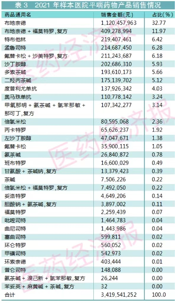 从药品来看,2021年在样本医院销售的平喘药有32个,布地奈德、布地奈德+福莫特罗复方、特布他林、孟鲁司特和氟替卡松+沙美特罗复方位列前四。TOP10药品样本医院销售额合计超过29.96亿元,占87.60%,说明集中度较高。