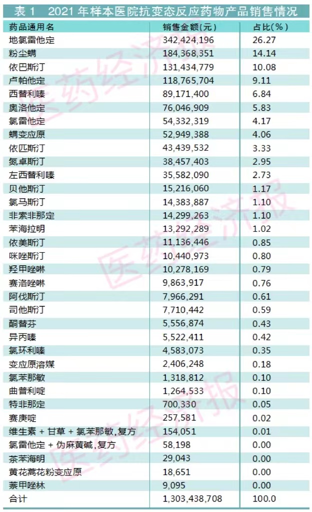从药品来看,2021年在样本医院销售的抗变态反应药物有34个,排前三的地氯雷他定、粉尘螨、依巴斯汀的销售额合计占比为50.49%,占了一半以上。