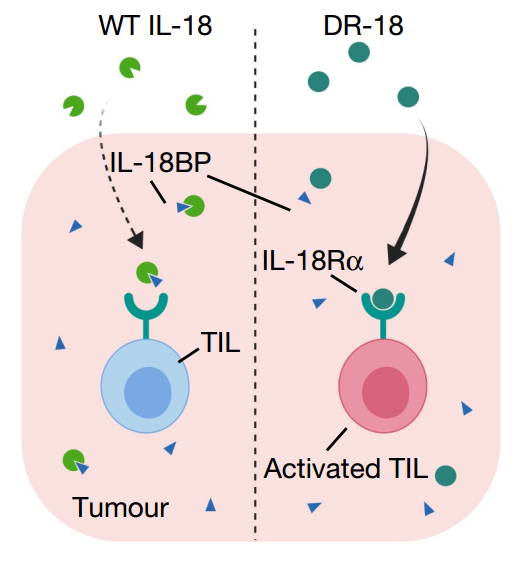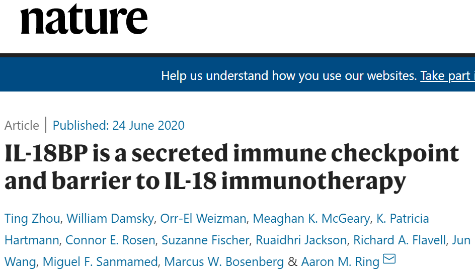 6月24日,Aaron Ring团队在 Nature 发表了一篇论文称,他们发现了一种可以阻止IL-18到达肿瘤的干扰蛋白,并且还设计了一种不会被干扰蛋白阻断的IL-18变体,该变体能显著减少对当前免疫疗法耐药小鼠的肿瘤。这一发现对于IL-18靶点以及整个细胞因子免疫治疗领域来说,都具有重大的意义。
