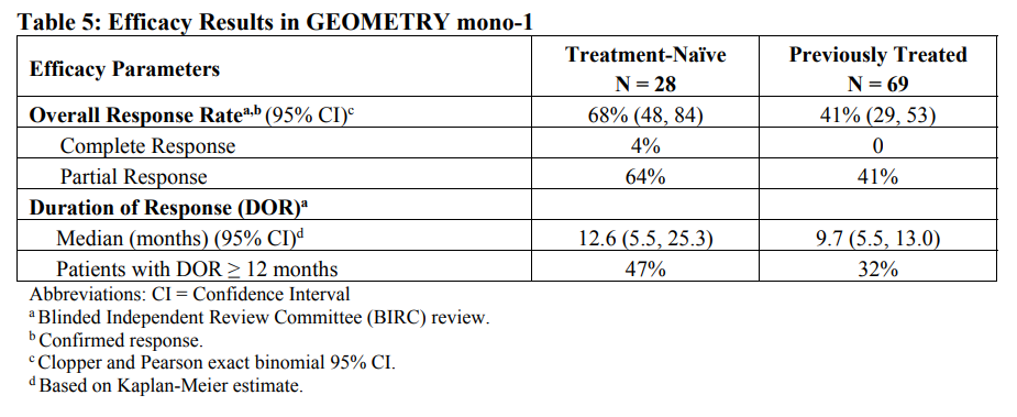 FDA此项批准主要基于一项代号为GEOMETRY mono-1的II期研究数据。该项开放标签、多中心、单臂研究招募了97例经RNA临床分析确证携带MET外显子14跳跃的NSCLC患者,给予capmatinib 400mg直至疾病进展或出现不可耐受毒性,主要终点是总体应答率(ORR),其他终点还包括应答持续期(DOR)。