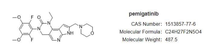 pemigatinib是一种选择性的成纤维细胞生长因子受体(FGFR)抑制剂,对FGFR1、FGFR2、FGFR3均有抑制作用。FGFRs在肿瘤细胞增殖、生存、迁移、新生血管形成中发挥着重要作用。FGFRs基因的融合、重排、易位和扩增与多种癌症的发生和进展密切相关。FDA曾授予pemigatinib用于接受过治疗的携带FGFR2基因易位的晚期/转移性或不可手术切除的胆管癌患者突破性疗法资格,以及治疗胆管癌的孤儿药资格。