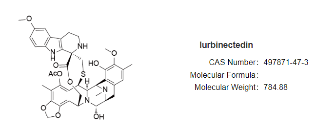 lurbinectedin是海鞘素衍生物,为RNA聚合酶II的抑制剂,能够与DNA双螺旋结构上的小沟共价结合,抑制RMG1和RMG2,使肿瘤细胞在有丝分裂过程中畸变、凋亡、最终减少细胞增殖。2018年8月,FDA授予lurbinectedin用于治疗小细胞肺癌的孤儿药资格。