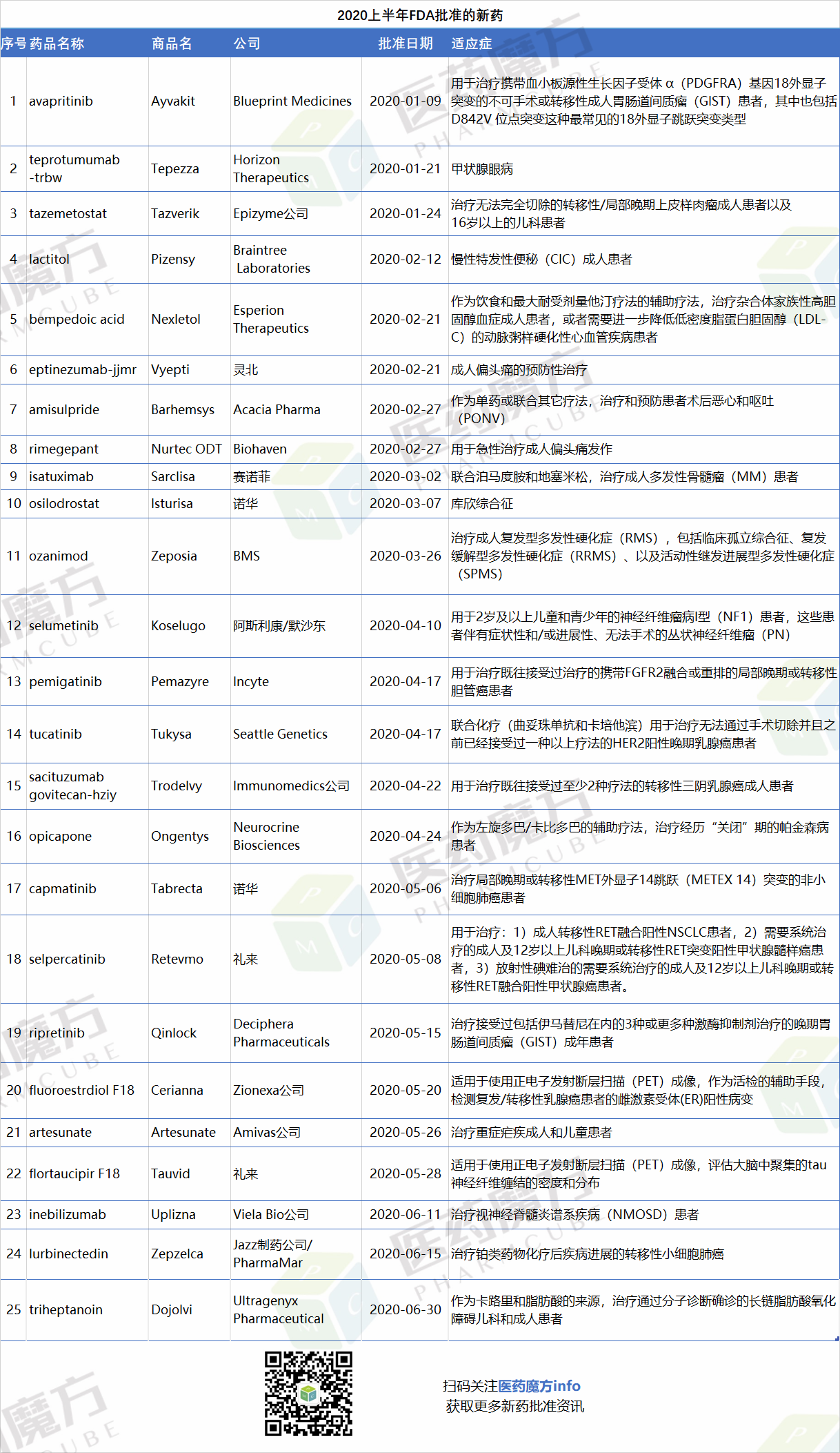 2020上半年,FDA共批准25个新药上市,包括19个新分子实体和6个新生物制品。从获批个数来看,上半年虽然新冠疫情全球流行,但FDA批准的新药数量较去年同期的14款增幅不小。
