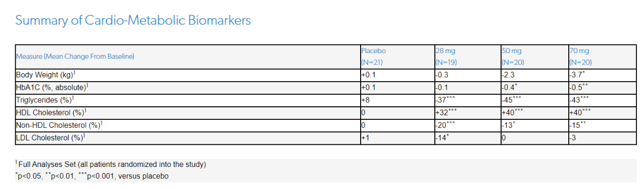 这项研究强调了EFX解决多种重要NASH合并症的潜力。研究人员观察到,所有剂量组在16周研究期间均出现平均体重减轻,70 mg剂量组在第16周时体重减轻3.7公斤(约8磅),达到统计显著水平。同时,血糖控制产生具有临床意义的改善,包括50 mg和70 mg剂量组的糖化血红蛋白(HbA1c)分别显著降低0.4和0.5。EFX还改善了血脂异常,包括在所有EFX剂量组中观察到HDL胆固醇显著升高和甘油三酯显著降低。