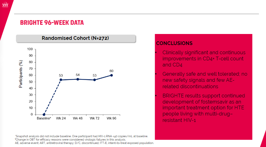 试验结果表明,经过24周Rukobia加其他抗逆转录病毒药物的治疗后,53%的参与者血液中HIV的RNA水平低到被认为检测不到。96周后,60%的参与者HIV的RNA水平继续受到抑制。