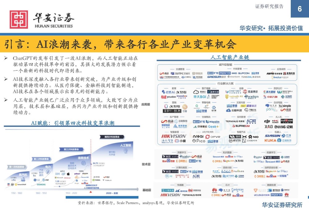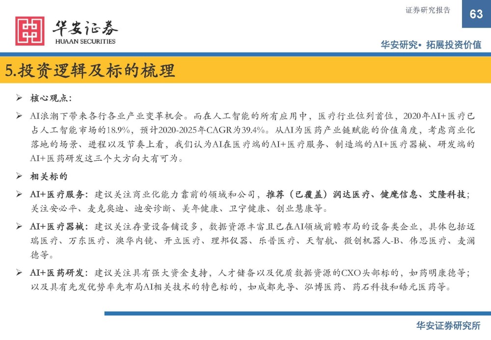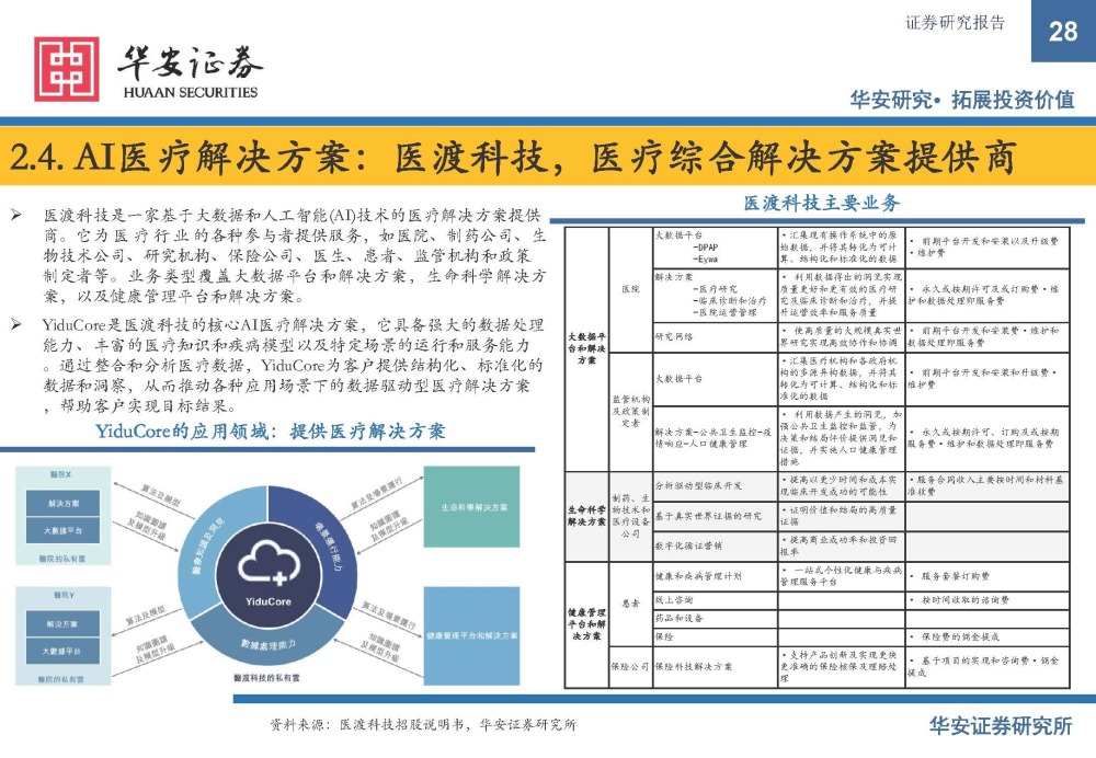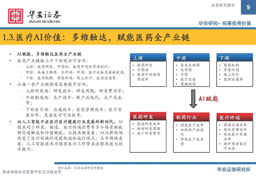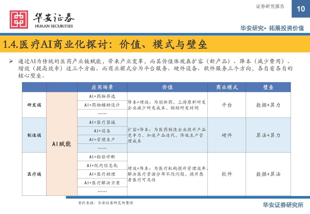 通过AI为传统的医药产业链赋能,带来产业变革,而其价值体现在扩容(新产品)、降本(减少费用)、 增效(提高效率)这三个方面。而商业模式分为平台服务、硬件设备、软件服务三个方向,各自有各自的 核心壁垒。