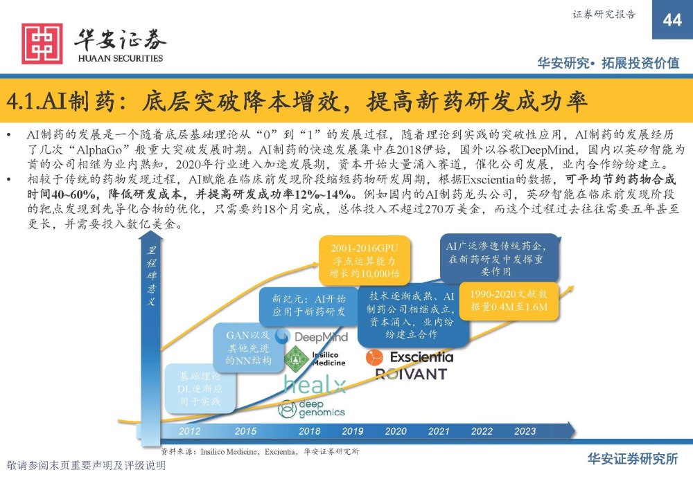 AI制药的发展是一个随着底层基础理论从“0”到“1”的发展过程,随着理论到实践的突破性应用,AI制药的发展经历 了几次“AlphaGo”般重大突破发展时期。AI制药的快速发展集中在2018伊始,国外以谷歌DeepMind,国内以英矽智能为 首的公司相继为业内熟知,2020年行业进入加速发展期,资本开始大量涌入赛道,催化公司发展,业内合作纷纷建立。 相较于传统的药物发现过程,AI赋能在临床前发现阶段缩短药物研发周期,根据Exscientia的数据,可平均节约药物合成 时间40~60%,降低研发成本,并提高研发成功率12%~14%。例如国内的AI制药龙头公司,英矽智能在临床前发现阶段 的靶点发现到先导化合物的优化,只需要约18个月完成,总体投入不超过270万美金,而这个过程过去往往需要五年甚至 更长,并需要投入数亿美金。