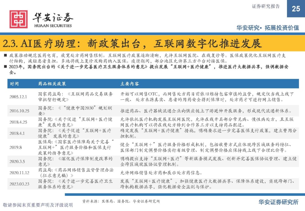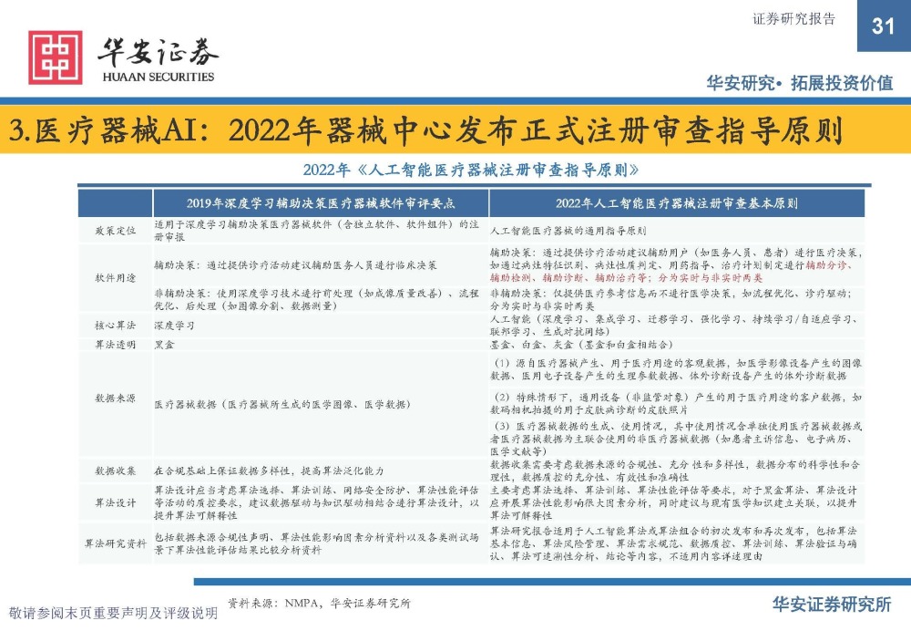AI医疗经历较长的验证期后,迎来快速兑现。我国对于医疗AI的研究始于1980年代,经过了算法由雏形初现到快速迭代、 深度学习拓展等阶段,在多年沉淀后迎来注册审批与市场过渡阶段。2020年前,由于商业路径不清晰、落地场景未被验证、临床价值不足等原因,医疗AI的价值市场认知不足,但截至目前,已有49个AI医疗器械获得NMPA颁布的Ⅲ类证,多家医 疗AI企业具备可落地的软件和可兑现的收入,医疗AI迎来快速发展阶段。
