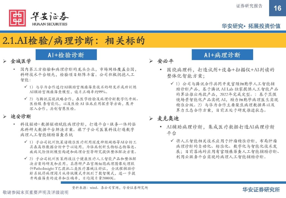 AI检验诊断:检验医学是现代医学的重要组成部分,临床决策所需信息70%来自检验 ,而以数据挖掘、机器学习 (machine learning, ML)、专家系统为支撑的 AI 技术正在成为强大的辅助工具。AI可以自动验证报告,进行初步审 核;全实验室智慧互联,质量控制将更为精细、快速、简便,节约质控成本的同时,提高检验质量。