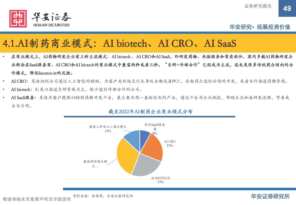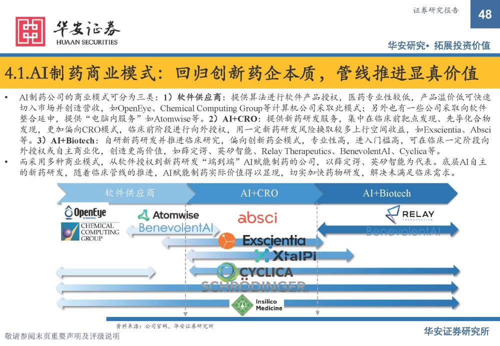 AI制药公司的商业模式可分为三类:1)软件供应商:提供算法进行软件产品授权,医药专业性较低,产品溢价低可快速 切入市场并创造营收,如OpenEye、Chemical Computing Group等计算机公司采取此模式;另外也有一些公司采取向软件 整合延申,提供“电脑内服务”如Atomwise等。2)AI+CRO:提供新药研发服务,集中在临床前靶点发现、先导化合物 发现,更加偏向CRO模式,临床前阶段进行向外授权,用一定新药研发风险换取较多上行空间收益,如Exscientia、Absci 等。3)AI+Biotech:自研新药研发并推进临床研究,偏向创新药企模式,专业性高,进入门槛高,可在临床一定阶段向 外授权或自主商业化,创造更高价值,如薛定谔、英矽智能、Relay Therapeutics、BenevolentAI、Cyclica等。