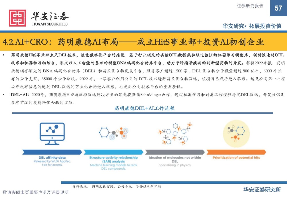 药明康德HitS事业部立足DEL技术,注重数字化平台的建设,基于行业领先的实验DEL数据集和经过验证的机器学习模型库,创新性地将DEL 技术和机器学习相结合,形成以人工智能为基础的新型DNA编码化合物库平台,助力于肿瘤等疾病的创新型药物的开发。根据2022年报,药明 康德拥有领先的 DNA 编码化合物库(DEL)和苗头化合物发现平台,服务客户超过 1500 家,DEL 化合物分子数量超过 900 亿个,6000 个独 有的分子支架,35000 个分子砌块。2022 年,一家客户利用公司的 DEL 技术进行苗头化合物筛选,该项目已成功进入临床。这是公司第一个有 公开发布信息的通过 DEL 筛选的苗头化合物进入临床,也是对公司技术平台的重要验证。