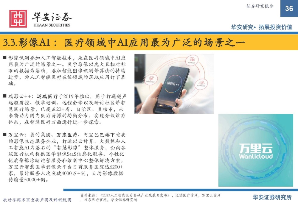 影像识别叠加人工智能技术,是在医疗领域中AI应 用最为广泛的场景之一。医学影像以庞大且相对标 准的数据为基础,叠加智能图像识别等算法的持续 进步,为人工智能医疗在该领域的落地应用打下基 础。 瑞影云++:迈瑞医疗于2019年推出,用于打通超声 远程质控、教学培训、远程会诊以及研讨社区等智 慧医疗场景,已覆盖20+省、自治区、直辖市,未 来将助力国内医疗资源的均衡分布,实现分级诊疗 体系,在智慧医疗方面进行进一步探索。 万里云:美的集团、万东医疗、阿里巴巴旗下重要 的影像生态服务企业,打造以云计算、大数据和人 工智能AI为基石的“智慧影像”整体服务,面向各 级医疗机构提供医学影像SaaS信息化服务、个性化 优质影像诊断运营服务和诊断中心整体解决方案。 万里云智慧医学影像云平台目前服务医院达6200+ 家,累计服务人次突破4000万+例,日均影像数据 传输量50000+例。