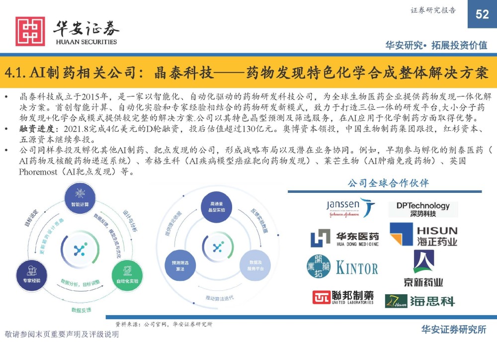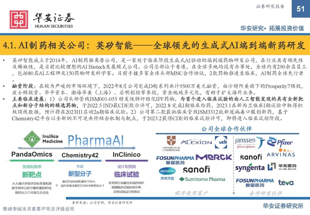而采用多种商业模式,从软件授权到新药研发“端到端”AI赋能制药的公司,以薛定谔、英矽智能为代表。底层AI自主 的新药研发,随着临床管线的推进,AI赋能制药实际价值得以显现,切实加快药物研发,解决未满足临床需求。