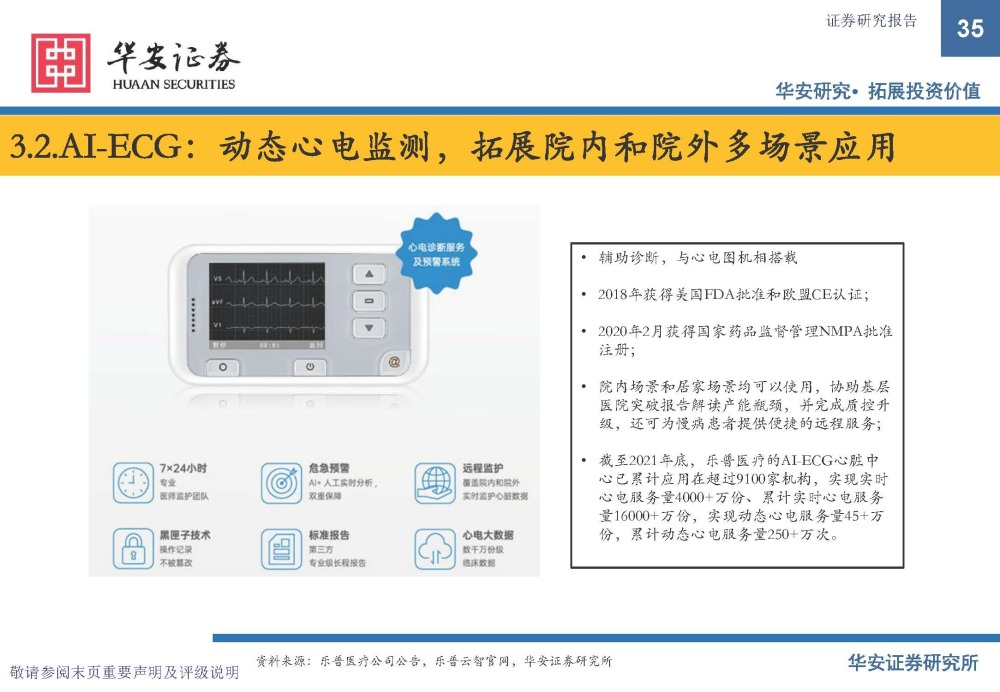 辅助诊断,与心电图机相搭载 。2018年获得美国FDA批准和欧盟CE认证; 2020年2月获得国家药品监督管理NMPA批准 注册; 院内场景和居家场景均可以使用,协助基层 医院突破报告解读产能瓶颈,并完成质控升 级,还可为慢病患者提供便捷的远程服务; 截至2021年底,乐普医疗的AI-ECG心脏中 心已累计应用在超过9100家机构,实现实时 心电服务量4000+万份、累计实时心电服务 量16000+万份,实现动态心电服务量45+万 份,累计动态心电服务量250+万次。