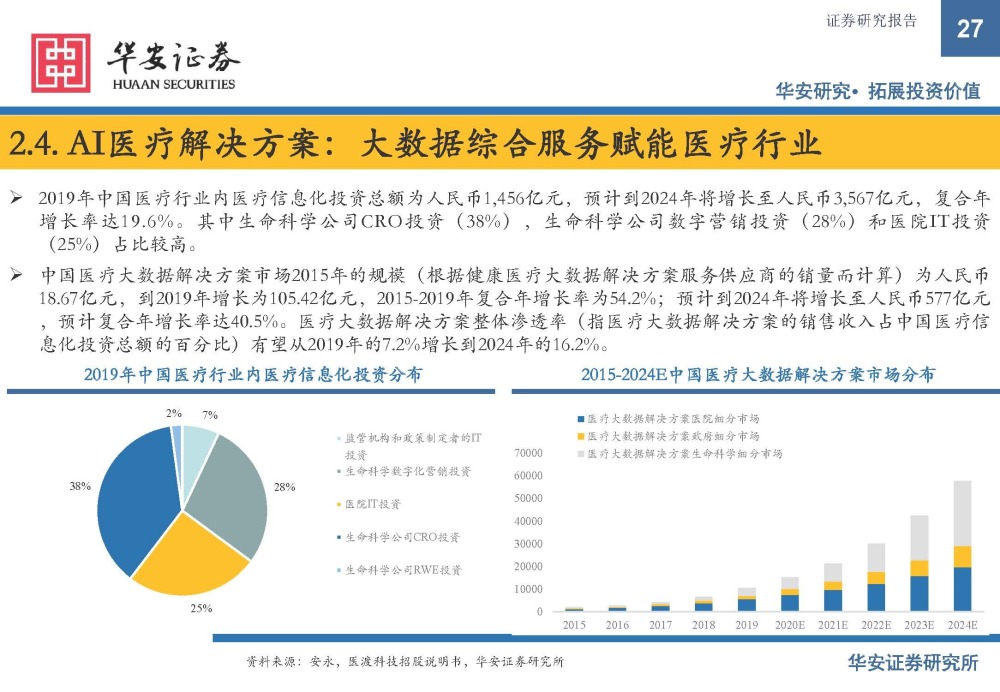 中国医疗大数据解决方案市场2015年的规模(根据健康医疗大数据解决方案服务供应商的销量而计算)为人民币 18.67亿元,到2019年增长为105.42亿元,2015-2019年复合年增长率为54.2%;预计到2024年将增长至人民币577亿元 ,预计复合年增长率达40.5%。医疗大数据解决方案整体渗透率(指医疗大数据解决方案的销售收入占中国医疗信 息化投资总额的百分比)有望从2019年的7.2%增长到2024年的16.2%。