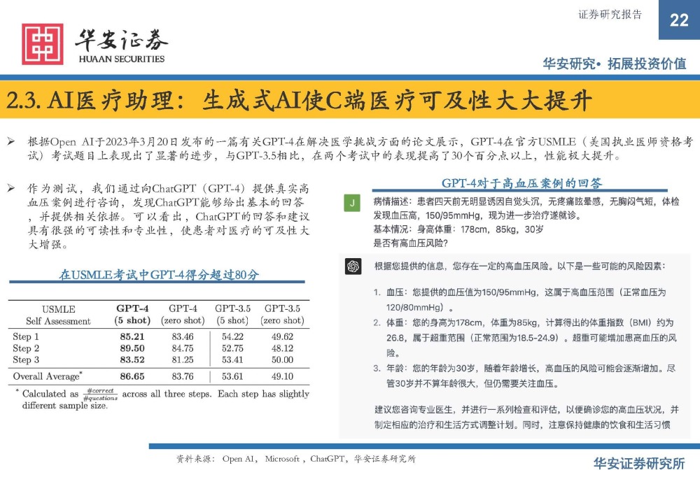 根据Open AI于2023年3月20日发布的一篇有关GPT-4在解决医学挑战方面的论文展示,GPT-4在官方USMLE(美国执业医师资格考 试)考试题目上表现出了显著的进步,与GPT-3.5相比,在两个考试中的表现提高了30个百分点以上,性能极大提升。