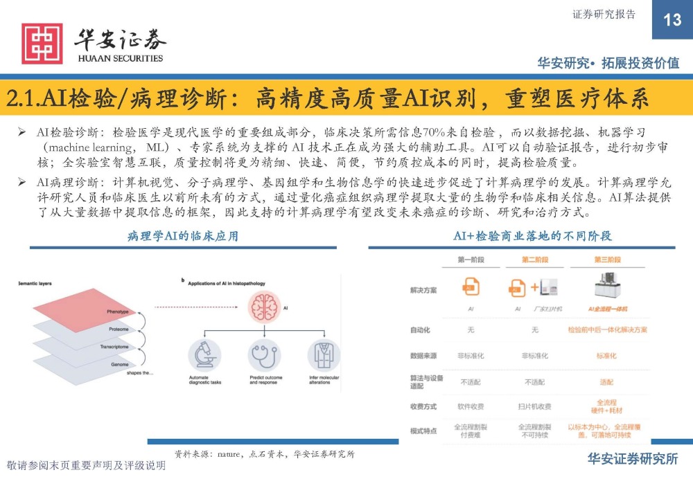 AI病理诊断:计算机视觉、分子病理学、基因组学和生物信息学的快速进步促进了计算病理学的发展。计算病理学允 许研究人员和临床医生以前所未有的方式,通过量化癌症组织病理学提取大量的生物学和临床相关信息。AI算法提供 了从大量数据中提取信息的框架,因此支持的计算病理学有望改变未来癌症的诊断、研究和治疗方式。