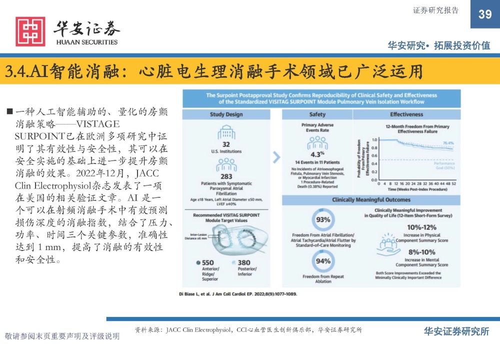 一种人工智能辅助的、量化的房颤 消融策略——VISTAGE SURPOINT已在欧洲多项研究中证 明了其有效性与安全性,其可以在 安全实施的基础上进一步提升房颤 消融的效果。2022年12月,JACC Clin Electrophysiol杂志发表了一项 在美国的相关验证文章。AI 是一 个可以在射频消融手术中有效预测 损伤深度的消融指数,结合了压力、 功率、时间三个关键参数,准确性 达到 1 mm,提高了消融的有效性 和安全性。