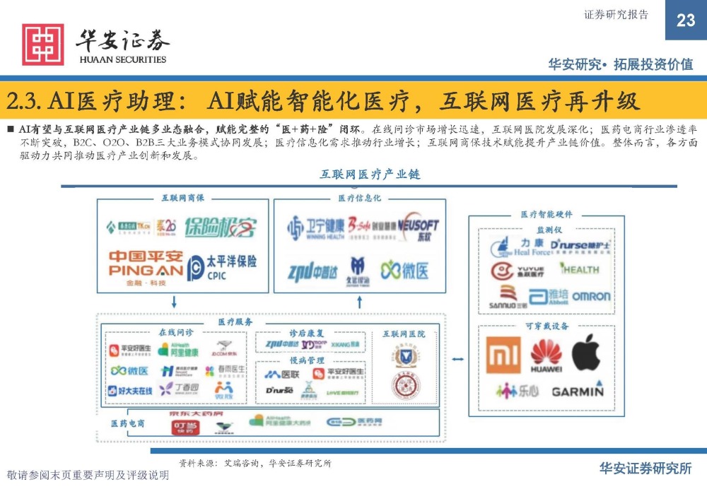 AI有望与互联网医疗产业链多业态融合,赋能完整的“医+药+险”闭环。在线问诊市场增长迅速,互联网医院发展深化;医药电商行业渗透率 不断突破,B2C、O2O、B2B三大业务模式协同发展;医疗信息化需求推动行业增长;互联网商保技术赋能提升产业链价值。整体而言,各方面 驱动力共同推动医疗产业创新和发展。