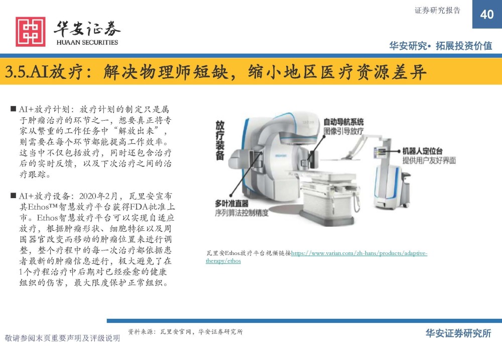 AI+放疗计划:放疗计划的制定只是属 于肿瘤治疗的环节之一,想要真正将专 家从繁重的工作任务中“解放出来”, 则需要在每个环节都能提高工作效率。 这当中不仅包括放疗,同时还包含治疗 后的实时反馈,以及下次治疗之间的治 疗跟踪。 AI+放疗设备:2020年2月,瓦里安宣布 其Ethos™智慧放疗平台获得FDA批准上 市。Ethos智慧放疗平台可以实现自适应 放疗,根据肿瘤形状、细胞特征以及周 围器官改变而移动的肿瘤位置来进行调 整,整个疗程中的每一次治疗都依据患 者最新的肿瘤信息进行,极大避免了在 1个疗程治疗中后期对已经痊愈的健康 组织的伤害,最大限度保护正常组织。