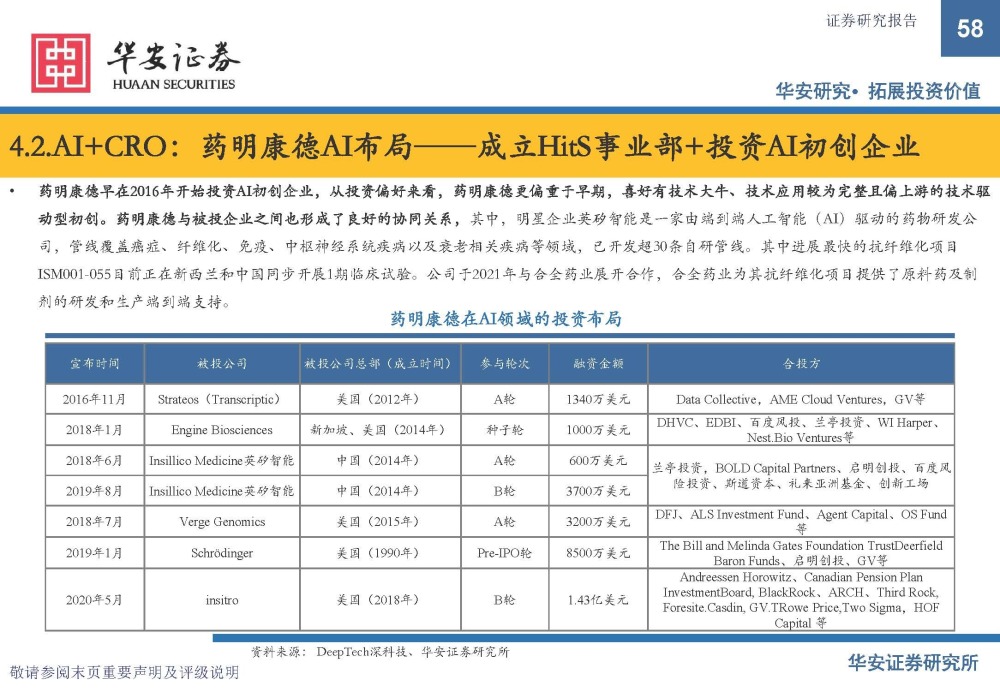 AI+CRO:药明康德AI布局——成立HitS事业部+投资AI初创企业