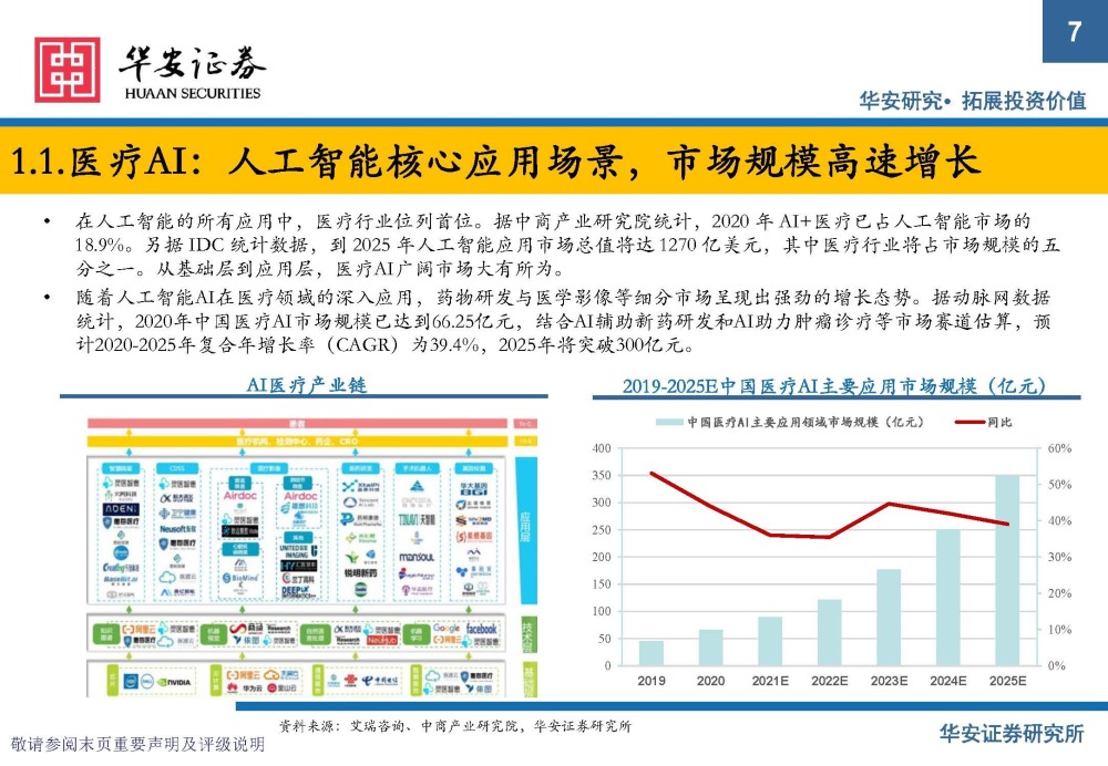 在人工智能的所有应用中,医疗行业位列首位。据中商产业研究院统计,2020 年 AI+医疗已占人工智能市场的 18.9%。另据 IDC 统计数据,到 2025 年人工智能应用市场总值将达 1270 亿美元,其中医疗行业将占市场规模的五 分之一。从基础层到应用层,医疗AI广阔市场大有所为。 随着人工智能AI在医疗领域的深入应用,药物研发与医学影像等细分市场呈现出强劲的增长态势。据动脉网数据 统计,2020年中国医疗AI市场规模已达到66.25亿元,结合AI辅助新药研发和AI助力肿瘤诊疗等市场赛道估算,预 计2020-2025年复合年增长率(CAGR)为39.4%,2025年将突破300亿元。