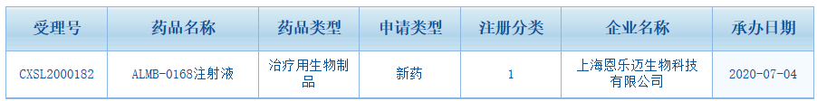 7月4日,石药集团子公司上海恩乐迈生物科技有限公司提交的1类新药ALMB-0168注射液临床申请获得CDE受理。