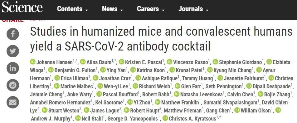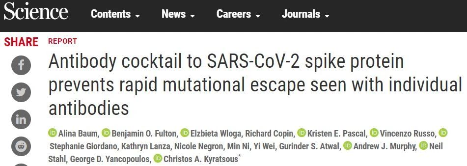 REGN-COV2由两种与新冠病毒刺突蛋白的关键受体结合域(RBD)相结合的单克隆抗体构成。这两款抗体的RBD结合位点不同,因此组合使用,可以降低病毒通过产生基因突变,逃避单抗体治疗的能力。关于这两款抗体的临床前研究近日已经在《科学》杂志上发布。在1期临床试验中,独立数据监查委员对包含30例住院和非住院COVID-19患者的初始队列的审查发现REGN-COV2表现出良好的安全性。
